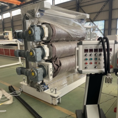 Máquina extrusora de láminas de blister de PVCMoldeo y formación: el PVC fundido se extruye a través de una matriz en T para formar una lámina continua. Luego, la masa fundida ingresa a los rodillos de enfriamiento y fraguado (temperatura 20-40°C) para un rápido enfriamiento y solidificación, formando finalmente la forma inicial de la hoja. Equipo: Tres rodillos ajustan el espacio entre rodillos y la velocidad para enrollar la lámina preformada hasta el espesor objetivo (normalmente 0,2-1,0 mm, siendo común 0,3-0,5 mm para forros de prendas), al mismo tiempo que mejoran aún más la suavidad de la superficie.