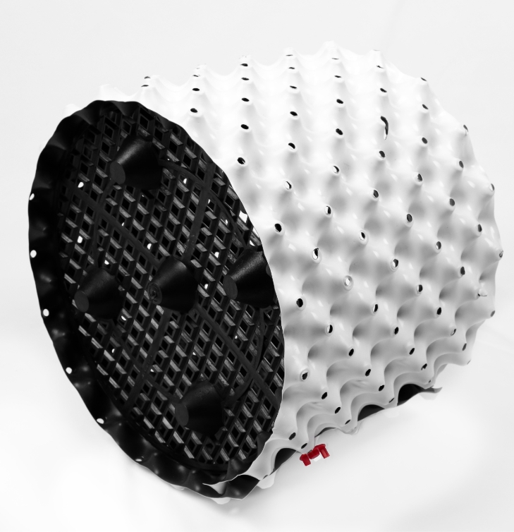 Formación de estructuras de control de raíces: presiona continuamente estructuras onduladas/protuberantes elevadas y empotradas alternadas sobre el material de la lámina y perfora orificios de ventilación en las puntas de las protuberancias para lograr un efecto físico de control de raíces de "control de raíces a base de aire".